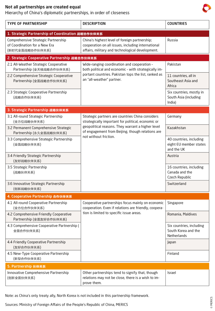Pour comprendre la complexe classification des relations diplomatiques chinoises, voici un graphe explicatif élaboré par le think-tank Merics en 2021.