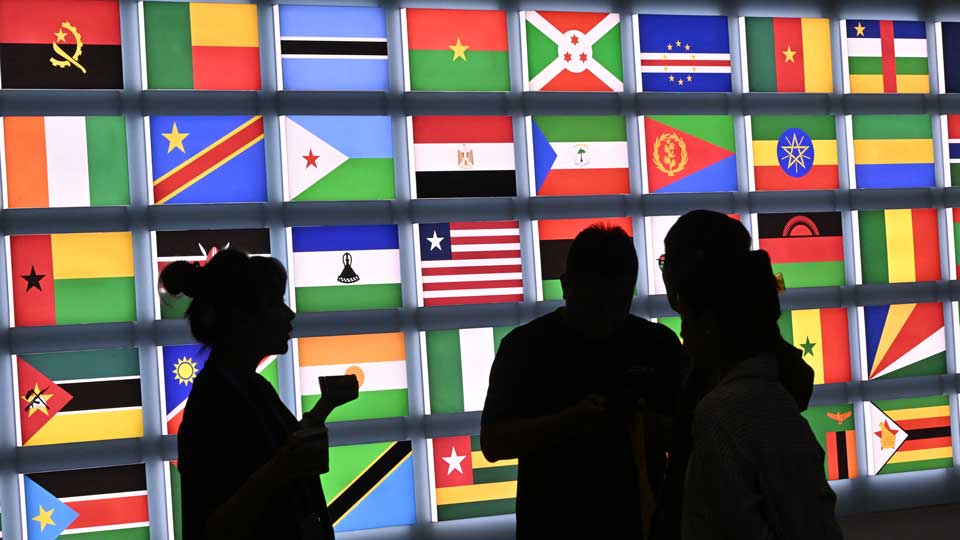Des personnes se tiennent devant un écran affichant les drapeaux des pays participant au Forum sur la coopération sino-africaine (FOCAC) au Centre national des congrès de Pékin, le 3 septembre 2024.