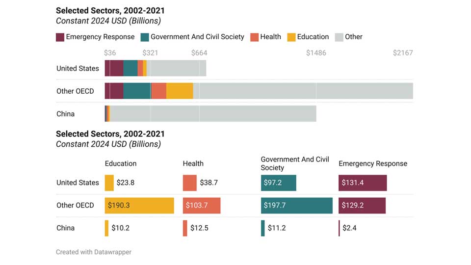 Une nouvelle note d’AidData, une unité de recherche du College of William and Mary, réfute cette hypothèse en montrant que, si la Chine a beaucoup investi dans les infrastructures et d’autres secteurs commerciaux, ses dépenses dans les domaines traditionnels de l’aide, comme la santé, ne sont pas comparables à celles de l’aide occidentale.