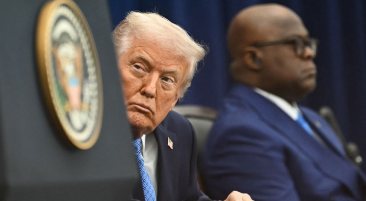 Le président américain Donald Trump (au centre) et et le président de la République démocratique du Congo Félix Tshisekedi (à droite) à l'Institut américain pour la paix à Washington, DC, le 4 décembre 2025. ANDREW CABALLERO-REYNOLDS / AFP