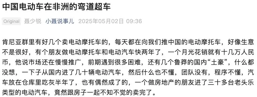 Le célèbre commentateur en ligne chinois basé en Afrique de l’Est, Xiao Nie « 小聂说事儿 », qui relate le quotidien des immigrés chinois sur le continent, a récemment publié un article abordant les préjugés courants à propos du marché de consommation africain. Cet article fait suite à une avalanche de commentaires sur une de ses publications précédentes concernant les fortes ventes de motos électriques chinoises en Afrique. Beaucoup de lecteurs soutenaient que les produits chinois ne rencontrent du succès sur le continent que parce qu’ils sont bon marché et de qualité médiocre, et que les consommateurs africains n’auraient tout simplement pas les moyens d’acheter mieux.