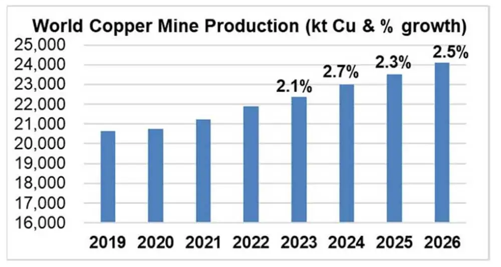 Lors de sa dernière réunion à Lisbonne, l’International Copper Study Group (ICSG), organisation intergouvernementale des pays producteurs et consommateurs de cuivre, a projeté une croissance de 2,3 % de la production minière mondiale en 2025, pour atteindre 23,5 millions de tonnes métriques (Mt). Cette hausse sera portée par les extensions de la mine Kamoa-Kakula en RDC, Oyu Tolgoi en Mongolie et le projet Malmyzh en Russie. D’ici 2026, la production devrait croître de 2,5 % supplémentaires, grâce aux relances au Chili, en Zambie, en Indonésie et aux nouveaux chantiers au Brésil, en Équateur, en Érythrée, en Angola et au Maroc.