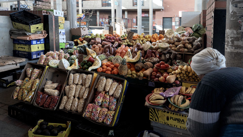 Une vendeuse dispose des fruits sur son étal au marché de la station de taxis Bara à Diepkloof, Soweto, le 13 août 2023. (Photo par Luca Sola / AFP)