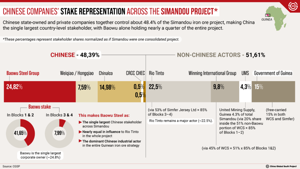 Les blocs n°1 et n°2 sont exploités par WCS (Winning Consortium Simandou), coentreprise réunissant Winning International Group, conglomérat basé à Singapour, et l’entreprise chinoise China Hongqiao Group, cotée à Hong-Kong et spécialisée dans la production et la vente d’aluminium.