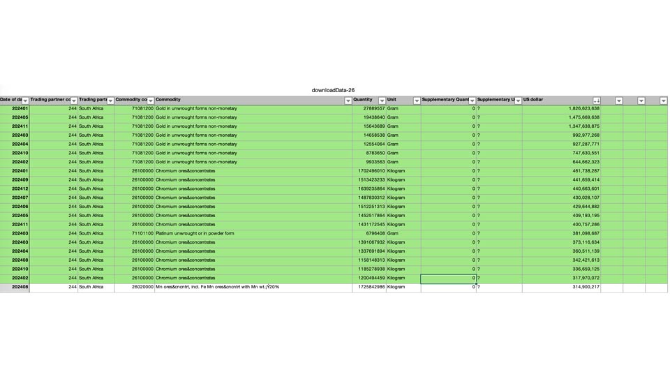 Selon les douanes chinoises, en 2024, les minerais d’or et de chromes bruts ont largement dominé les exportations sudafricaines vers la Chine.